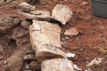 Neuquén, Argentina.- En las fotos tomadas el 14 de abril del 2023, investigadores trabajan en cercanías de la localidad de Añelo en Neuquén, ante el hallazgo del fémur de un titanosaurio. "Nos encontramos en las bardas norte de la localidad de Añelo, a unos tres kilómetros aproximadamente del casco urbano, por el hallazgo de un material de dinosaurio; hasta el momento, un fémur", precisó el paleontólogo de la UNCo, Juan Porfiri, en diálogo con la prensa.