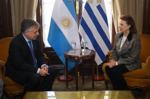 Buenos Aires, Argentina.- En la foto, el canciller uruguayo, Omar Paganini, llegó a Buenos Aires y mantuvo una reunión con su homóloga argentina, Diana Mondino, el 24 de mayo del 2024. Si bien, el encuentro tendría "agenda abierta", los equipos de ambas cancillerías trabajaban desde días atrás en acercar diversos temas de la relación bilateral. Según un comunicado, entre los temas de conversación estuvieron los asuntos diarios de frontera, el comercio bilateral y el desarrollo de la hidrovía del río Uruguay.