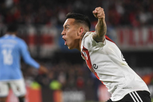 Buenos Aires, Argentina.- In the photos taken on April 19, 2023, River Plate faced Sporting Cristal in a match for the second date of group D of the Copa Libertadores, at the Monumental stadium, in Buenos Aires, against more than 80,000 viewers. The Argentine River Plate beat the Peruvian Sporting Cristal 4-2, for which he has three points, despite playing a good part of the match with ten players due to the expulsion of defender Enzo Díaz (38).