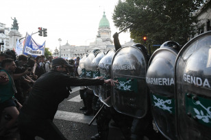 Buenos Aires, Argentina.- En las fotos tomadas el 1 de febrero del 2024, nuevos enfrentamientos entre policías y manifestantes se produjeron a las afueras del Congreso durante el debate en la Cámara de Diputados de la denominada ley Bases, lo que llevó a legisladores del kirchnerismo y la izquierda a presentar una moción para suspender la sesión, lo que fue rechazado por la mayoría del cuerpo legislativo.