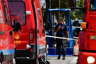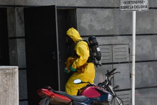 Buenos Aires.- En la foto tomada el 11 de enero de 2024, dos operarios de un laboratorio farmacéutico del barrio porteño de Mataderos debieron ser asistidos por el SAME este mediodía, tras el derrame de material tóxico, mientras que bomberos de la Ciudad de Buenos Aires procedieron a evacuar al resto del personal que se encontraba en el edificio sin que se registraran más afectados por el incidente, informaron fuentes policiales.